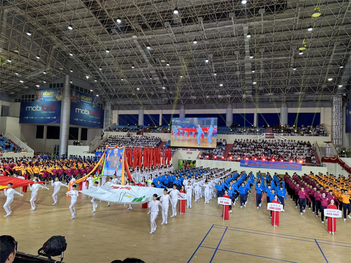 Hôm nay ngày 03/12/2023 Đ.c Đỗ Thị Mai Trang - Hiệu trưởng nhà trường tham dự lễ khai mạc Hội khỏe Phù Đổng thành phố Hải Phòng lần thứ XVII năm học 2023 – 2024, tại Khu Liên hợp thể thao thành phố (số 625 đường Phạm Văn Đồng, phường Hải Thành, quận Dương Kinh) với 09 môn thi, gồm: Điền kinh, Bơi, Bóng bàn, Cầu lông, Đá cầu, Cờ vua, Karatedo, Taekwondo và Thể dục Aerobic