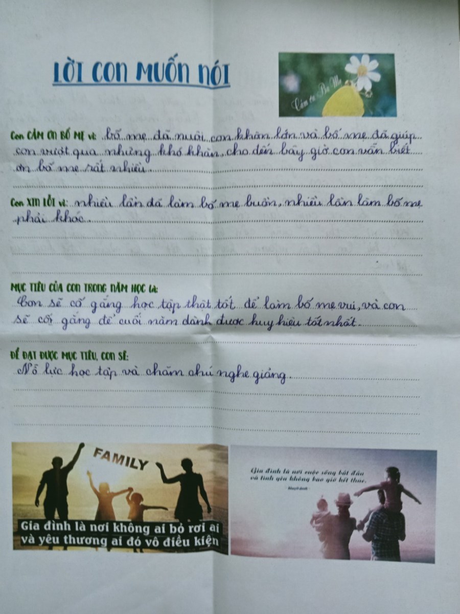 Tại lớp 5A1, với chủ đề “Chia sẻ - Thấu hiểu để yêu thương” phụ huynh đã được tham gia vào các hoạt động như: Cha mẹ có biết?; sau đó phụ huynh đọc những chia sẻ, mong muốn của con và cuối cùng viết tâm thư cho con.