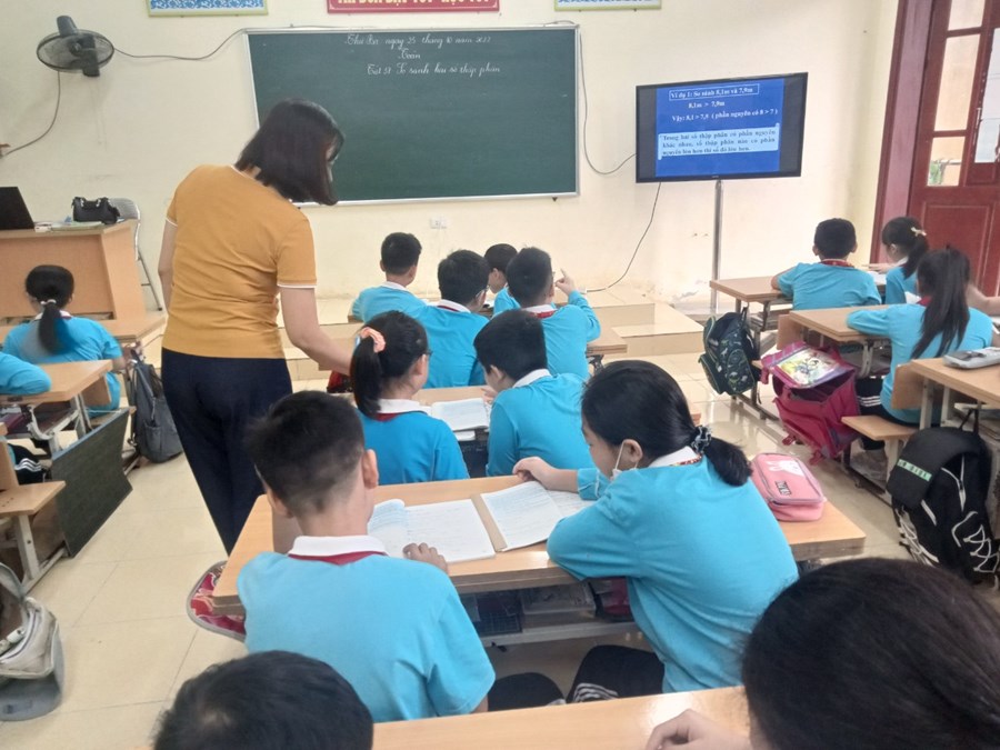 Đại diện khối 5 – cô giáo Hoàng Thị Hương đã thực hiện bài dạy “So sánh hai số thập phân”. Bằng sự chu đáo chuẩn bị cho tiết dạy, linh hoạt vận dụng những phương pháp, hình thức dạy học ở từng hoạt động, cô giáo đã mang đến cho các em học sinh một tiết học thú vị và bổ ích.