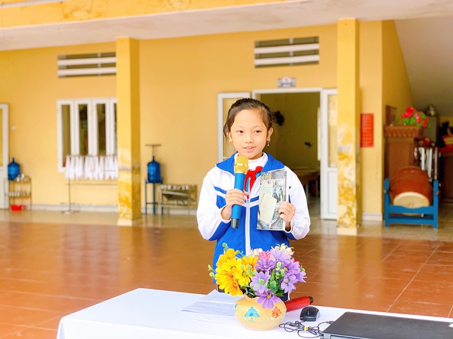 Nhân dịp kỷ niệm 78 năm ngày thành lập Quân đội nhân dân Việt Nam 22/12, trong buổi giới thiệu sách tháng 12, em Hoàng Vân Khánh – học sinh lớp 5A5 với giọng kể thật xúc động đã giới thiệu đến các thầy cô và các bạn học sinh toàn trường cuốn sách hay này. Mong rằng các em học sinh sẽ tìm ngay cho mình cuốn sách “Nhật ký Đặng Thùy Trâm’’. Hãy đắm mình trong từng dòng tâm trạng của Đặng Thùy Trâm, ta sẽ hiểu đất nước lớn lên từ những con người như thế. Để rồi chúng ta trân trọng, biết ơn và sống có ước mơ, hoài bão.
