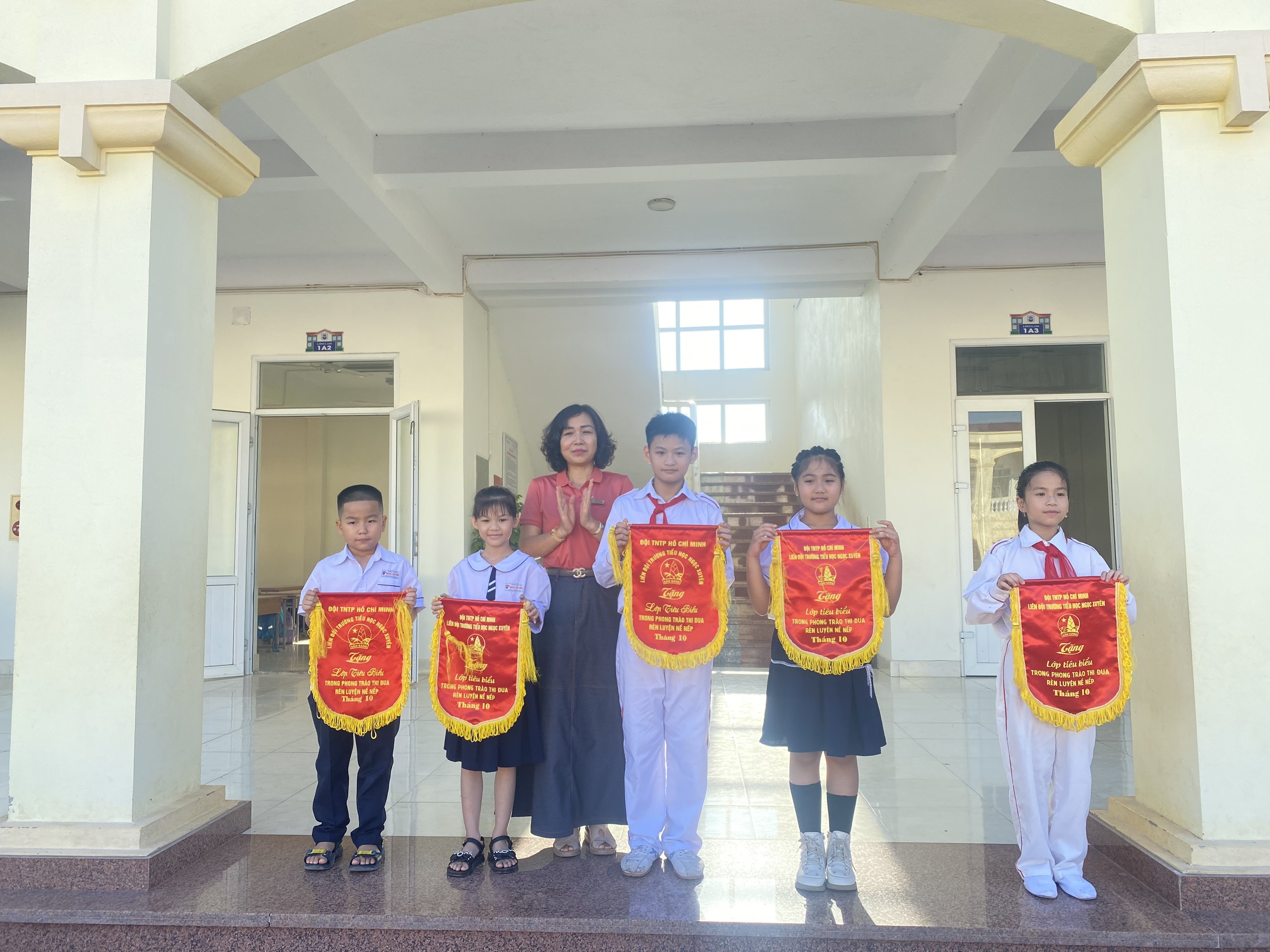 Trao cờ thi đua cho 5 lớp dẫn đầu phong trào tháng 10 đó là: 1A4, 2A4, 3A1, 4A1, 5A1