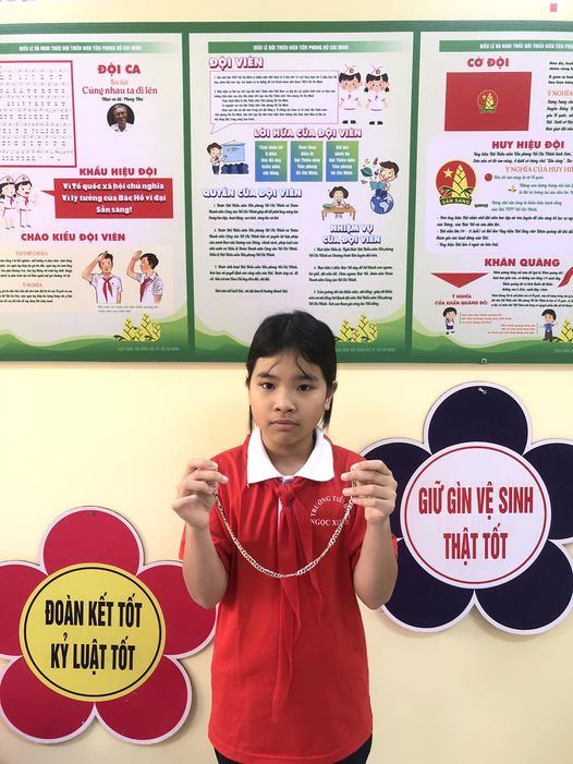 Tuyên dương em Nguyễn Bảo Yến lớp 4A4 nhặt được chiếc dây chuyền bằng bạc và đã mang nộp lại cho cô giáo. Đây là hành động rất xứng đáng được tuyên dương trong toàn Liên đội. Em chính là bông hoa đẹp trong vườn hoa “Nghìn việc tốt”