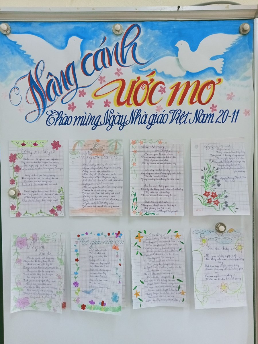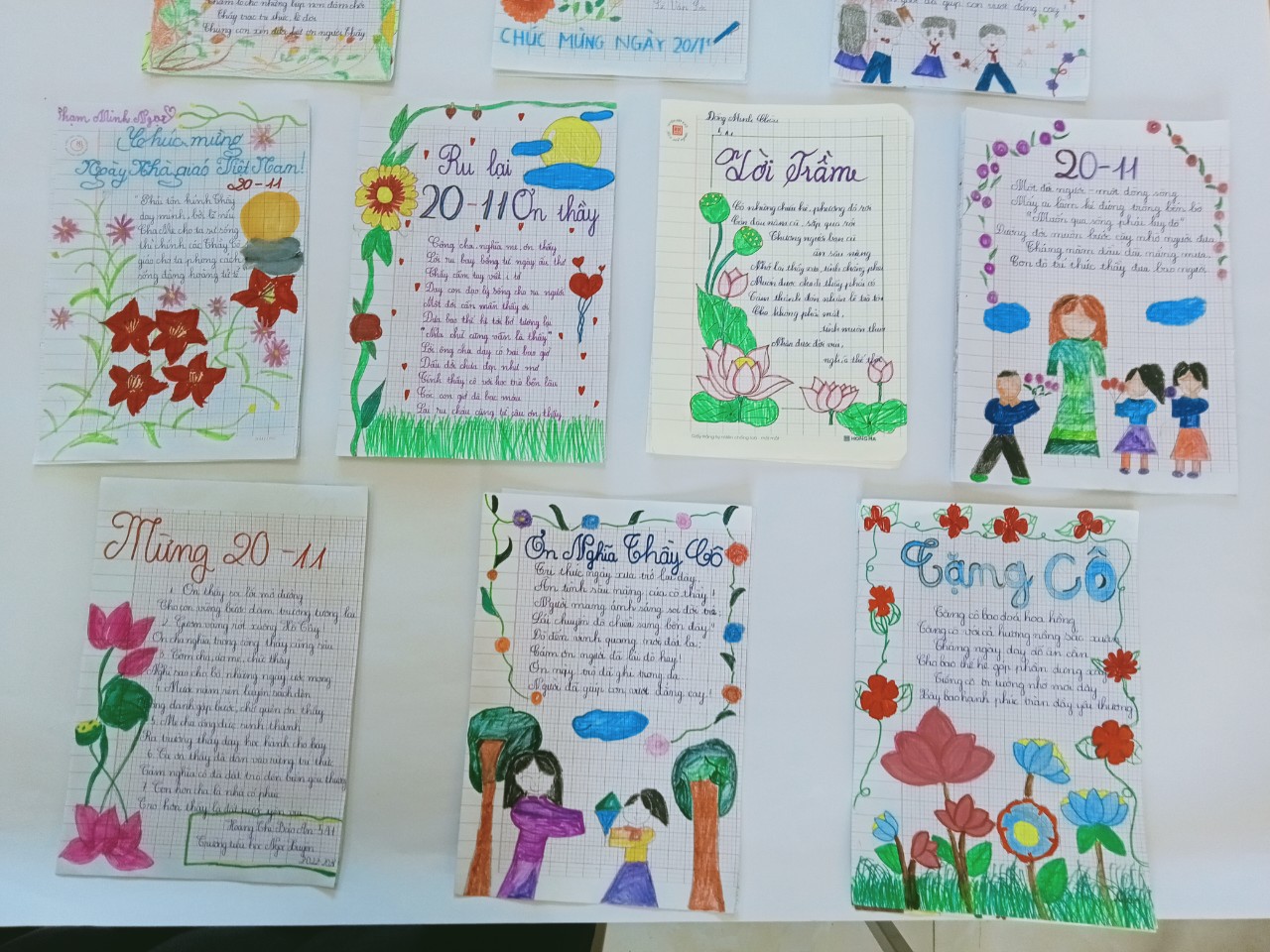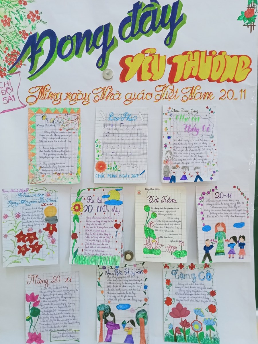Với chủ đề “Thương lắm thầy cô ơi!” các em học sinh đã được trổ tài qua các tác phẩm của mình: Viết xã luận, làm thơ, vẽ tranh, trang trí bài viết, ... Đây là hoạt động tập thể bổ ích nhằm phát huy khả năng sáng tạo và phát triển năng khiếu của học sinh.