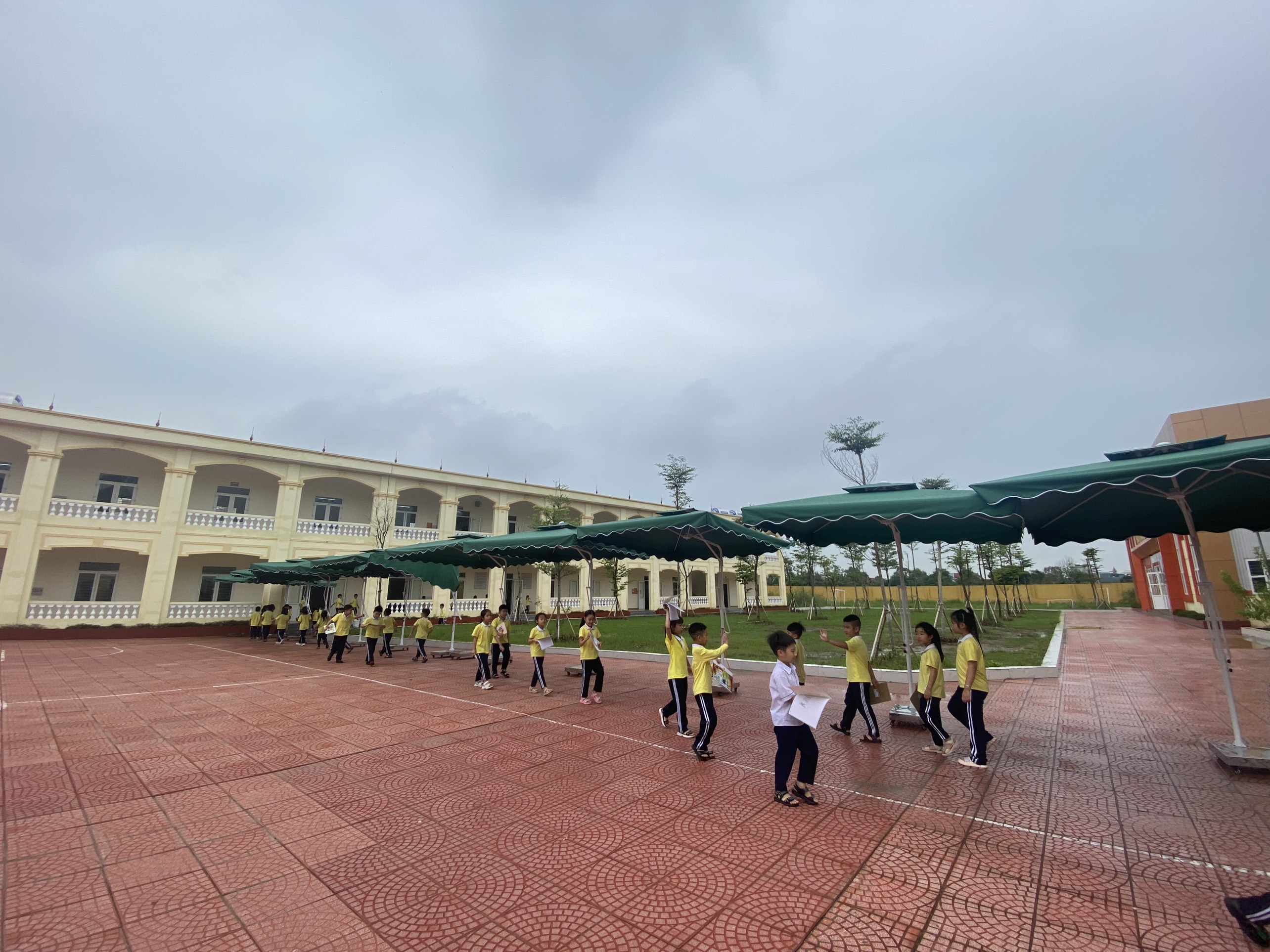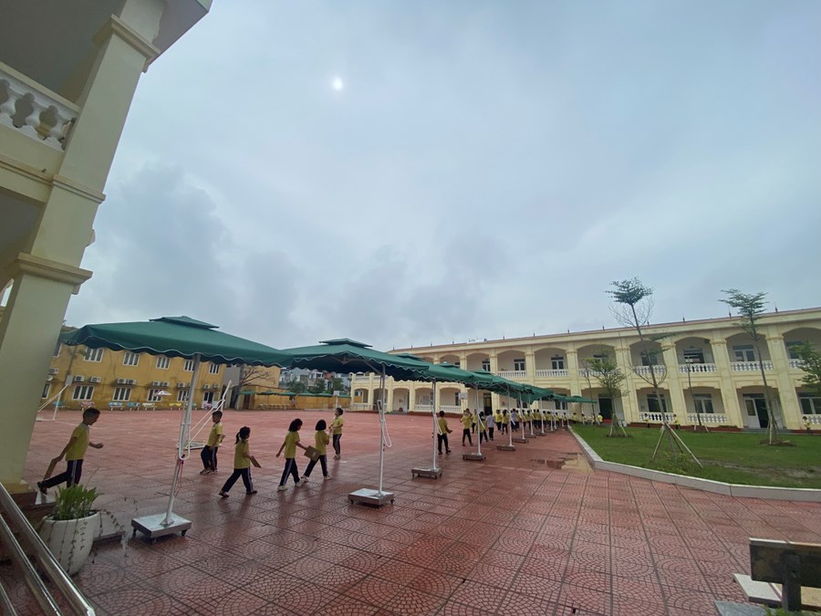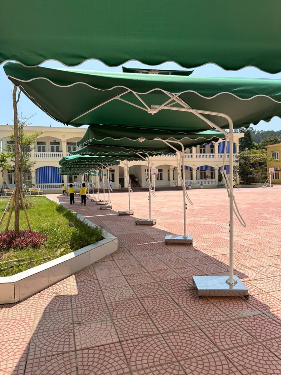 Hiện nay tình hình thời tiết thay đổi thất thường vì vậy trường THNX quyết định lắp đặt hệ thống ô che nắng, mưa cho các em học sinh toàn trường di chuyển tới phòng ăn bán trú, các phòng chức năng : Tin học, âm nhạc, mỹ thuật, tiếng anh, thể dục được kịp thời.