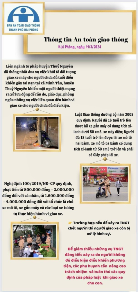 - Đối với các tai nạn giao thông liên quan đến học sinh phải khẩn trương điều tra, xử lý theo quy định của pháp luật; củng cố hồ sơ xử lý các hành vi giao xe hoặc để cho người không đủ điều kiện điều khiển phương tiện gây tai nạn; xác định cụ thể các nguyên nhân gây tai nạn và kiến nghị giải pháp phòng ngừa.