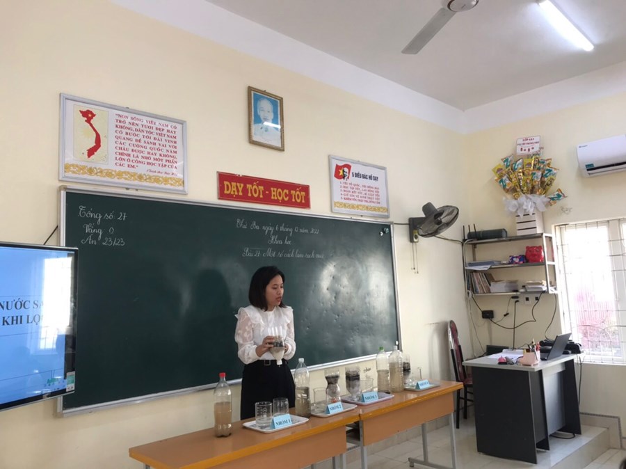 Đại diện khối 4 – cô giáo Phạm Thị Thu Huyền đã thực hiện bài dạy “Một số cách làm sạch nước”. Với sự chu đáo chuẩn bị cho tiết dạy, linh hoạt vận dụng những phương pháp, hình thức dạy học ở từng hoạt động, cô giáo đã mang đến cho các em học sinh một tiết học thú vị và bổ ích.